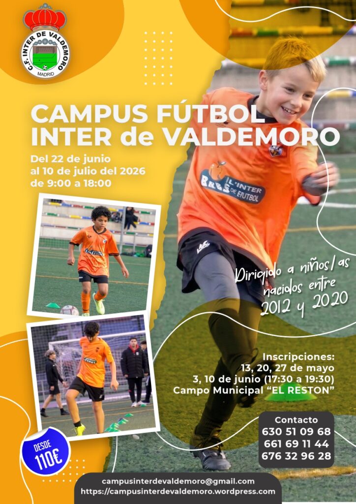 Buenas, querenos presentarte tu campus verano de Fútbol!!! Os hacemos llegar la información del Campus de Fútbol del C.F. Inter de Valdemoro, el Equipo Técnico ha buscado dar la maxima calidad con sesiones diarias de entrenamientos muy variadas y con 5 excursiones durante todo el campus, con las visitas de profesionales del mundo del fútbol y muchas sorpresas más para que sus hij@s tengan la mejor experiencia lúdica y deportiva de la Comunidad de Madrid. Siempre atendiendo a los niños con rigor, seguridad y una metodología educativa individualizada y eficaz. Desde el equipo de Coordinación os agradecemos la atención prestada.